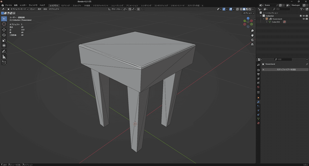 ・残っていたベベルのモディファイアを削除し天板の角だけ辺のベベルで面取り